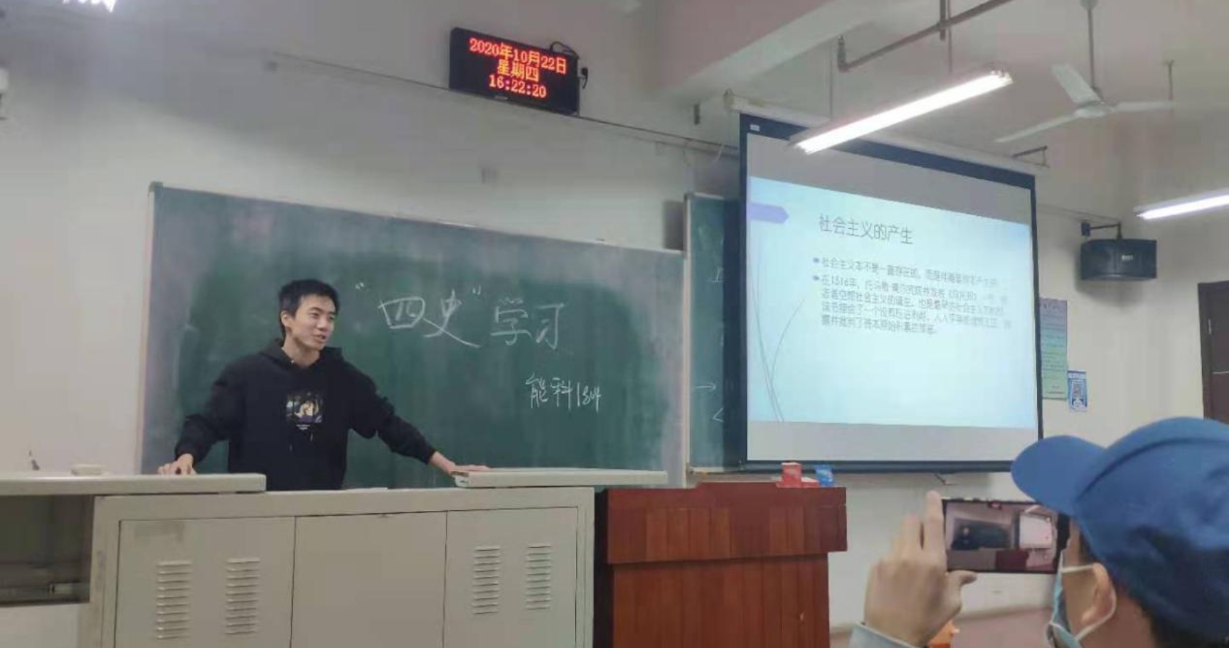 2020年10月22日下午四点,能科1804班在主B305教室召开了“学习四史”主题班会。首先,班长吕银慧同学和主持人石乾铮同学简要介绍了本次班会的流程和目的。班会主要分为四部分,分别是学习“党史”、“近代中国史”、“改革开放史”以及“社会主义发展史”,其主要目的是让同学们更加了解中国近现代以来的历史,深入理解中国特色社会主义思想,继承并发扬中华人民不畏艰险、敢于奋斗的伟大精神。同学们分成了四个小组,小组成员以时间轴的方式,十分详细地讲解了近代中国的发展历程,讲解生动有趣、引人入胜。