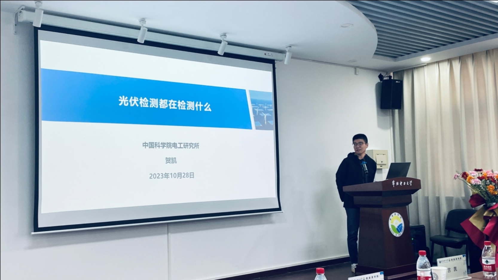 第二位报告人贺凯,是2015级可再生能源与清洁能源专业的硕士毕业生,现为中国科学院电工研究所助理研究员,他带来的报告题目为:光伏检测都在检测什么。贺凯以目前工作的内容为基础,为学院师生介绍了光伏检测在进入产业化后真正需要检测哪些方面,并为研究生们介绍了中国科学院电工研究所有关新能源方向适合的岗位。