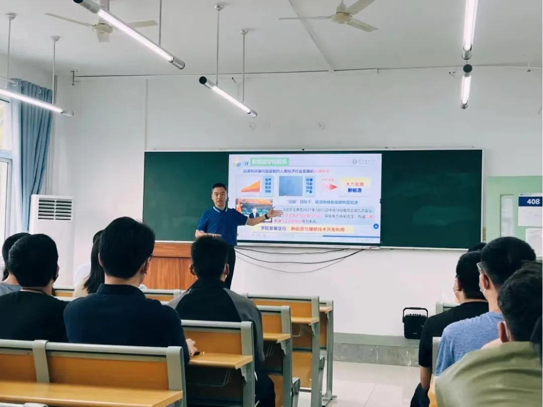 会上,李美成院长对新生的到来表示热烈的欢迎,他从科研平台、教师队伍、学术氛围等多方面对九妖漫画 的建设与发展历程进行详细的介绍,增进了同学们对学院的了解,并结合自身科研经历建议同学们“先把书读薄,再把书读厚”,珍惜青春年华,脚踏实地,在双碳目标下展现新能源学子良好风貌。